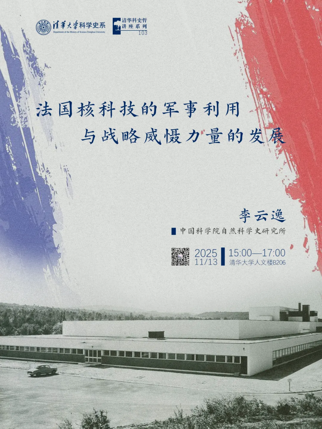 清华科史哲讲座第103讲预告:李云逸,“法国核科技的军事利用与战略威慑力量的发展” 2025年11月4日 11:13:18清华科史哲讲座第103讲预告:李云逸,“法国核科技的军事利用与战略威慑力量的发展”已关闭评论48 时间:2025年11月13日 15:00—17:00 地点:清华大学人文楼B206 主题:法国核科技的军事利用与战略威慑力量的发展 主讲人:李云逸(中国科学院自然科学史研究所) 讲座摘要 80年前,法国为在二战后重建大国地位,创设了国家主导的核科技研究体制。伴随冷战局势的变迁,原先和平利用核能的计划转向了军事用途。法国走上了核力量建设的自立自强之路。本讲座将探讨法国核力量的起源、技术创新点及其相关影响。 主讲人简介 李云逸,法国巴黎第一大学历史学博士,中国科学院自然科学史研究所副研究员。主要研究方向为世界科学技术史、法国科学技术史与中法关系史。用中、法、英等语言在相关学术期刊上发表论文近二十篇,并着重从不同角度看待冷战期间中法两国在外交与科技等领域的合作、分歧与对话,以及法国在尖端科技领域的创新发展与体制建设。主译的《科学与知识的历史》一书入围第十六届傅雷翻译出版奖。 Post Views: 58 我的微信 关注科学史微信公众号 微信扫一扫