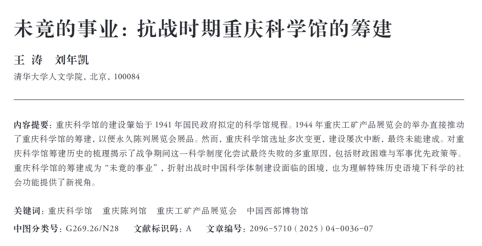 我系师生王涛、刘年凯在《文博学刊》发表论文”未竟的事业:抗战时期重庆科学馆的筹建“ 2025年11月5日 14:41:23我系师生王涛、刘年凯在《文博学刊》发表论文”未竟的事业:抗战时期重庆科学馆的筹建“已关闭评论54 下载全文: 未竟的事业:抗战时期重庆科学馆的筹建 Post Views: 47 我的微信 关注科学史微信公众号 微信扫一扫