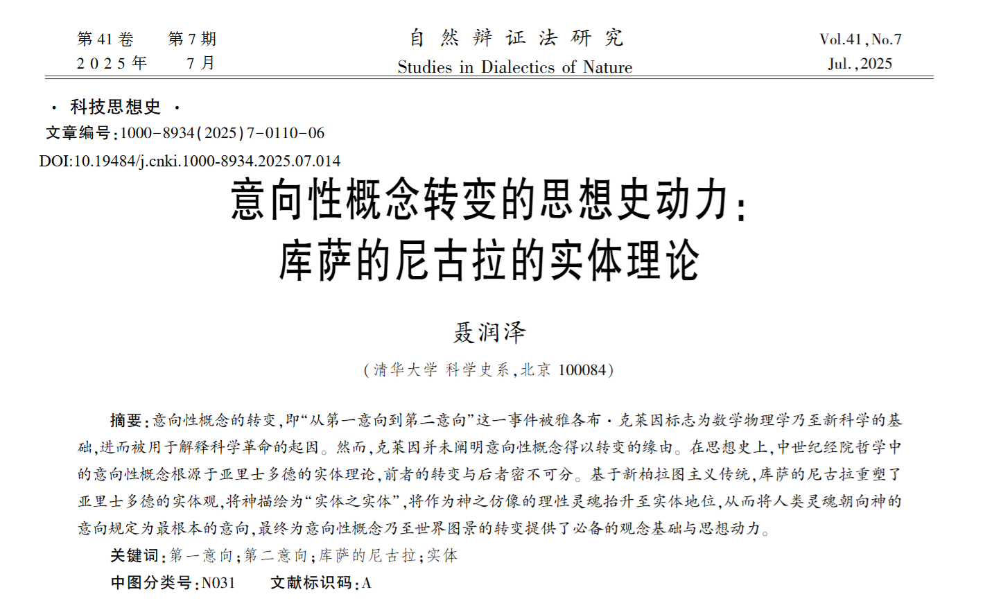 我系博士生聂润泽在《自然辩证法研究》发表论文“意向性概念转变的思想史动力:库萨的尼古拉的实体理论” 2025年11月11日 09:13:31我系博士生聂润泽在《自然辩证法研究》发表论文“意向性概念转变的思想史动力:库萨的尼古拉的实体理论”已关闭评论23 下载全文: 意向性概念转变的思想史动力:库萨的尼古拉的实体理论 Post Views: 27 我的微信 关注科学史微信公众号 微信扫一扫